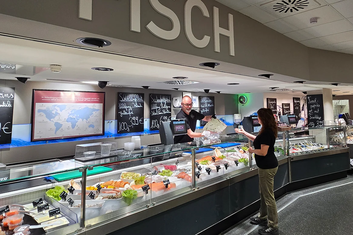 Sechsmal wöchentlich erreicht uns fangfrischer Fisch direkt von der Küste. In unserer über elf Meter langen, modernen Bedienungstheke finden Sie eine riesige Auswahl an Meeresspezialitäten und Süßwasserfischen.